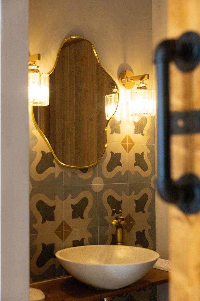 Alcuni elementi sono stati realizzati su misura e costruiti in casa: la porta del bagno e il mobile centrale con l’albero sono stati interamente creati con legno e compensato, poi rivestiti con piastrelle, unendo manualità e creatività.