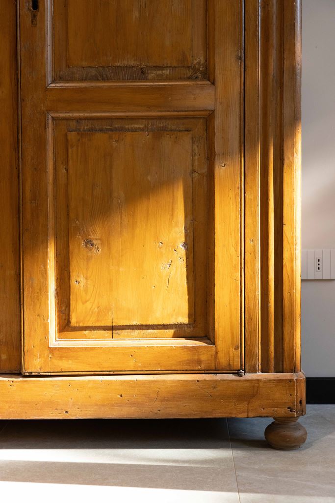 Per l’arredo, abbiamo deciso di dare nuova vita a pezzi trovati al mercatino: l’armadio, la cassa e il divano. Questi tre elementi sono stati restaurati, puliti e riverniciati direttamente dai ragazzi del salone, che con passione e dedizione sono riusciti a far risplendere oggetti dimenticati, rendendoli parte integrante del nuovo spazio.
