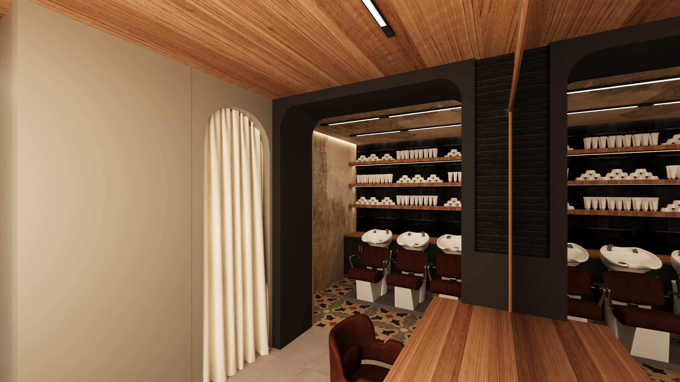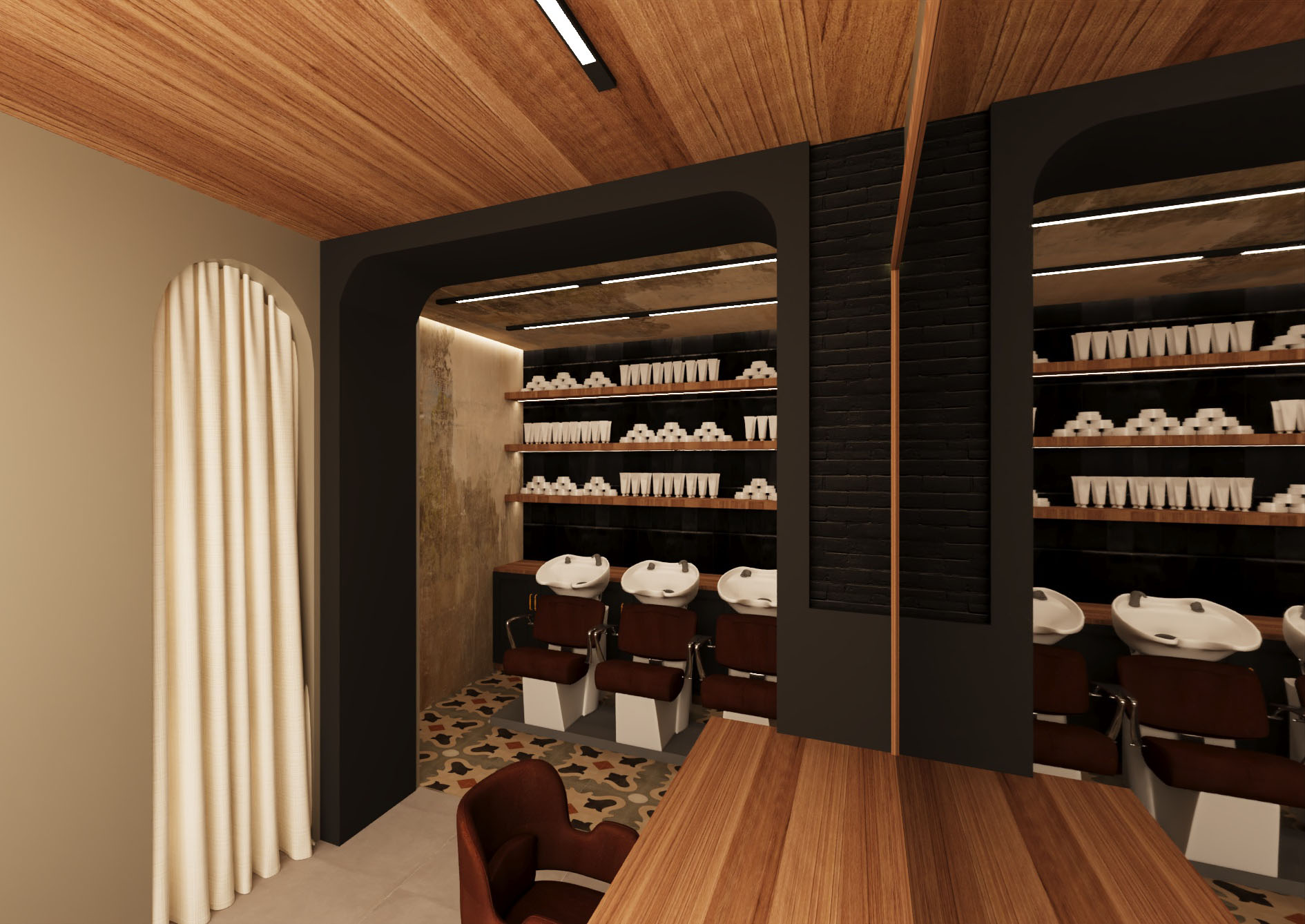 Il progetto di Meco Parrucchieri è stato una vera sfida, affrontata in tempi record: solo un mese per ristrutturare completamente il locale e riaprirlo prima del periodo natalizio. In poco tempo abbiamo scelto pavimenti e rivestimenti, trovando un giusto equilibrio tra costi ed estetica: materiali più preziosi e scenografici sono stati inseriti nei punti più visibili e illuminati dai LED, mentre per le zone generali abbiamo optato per soluzioni più semplici e sobrie. Una scelta intelligente e sempre vincente.