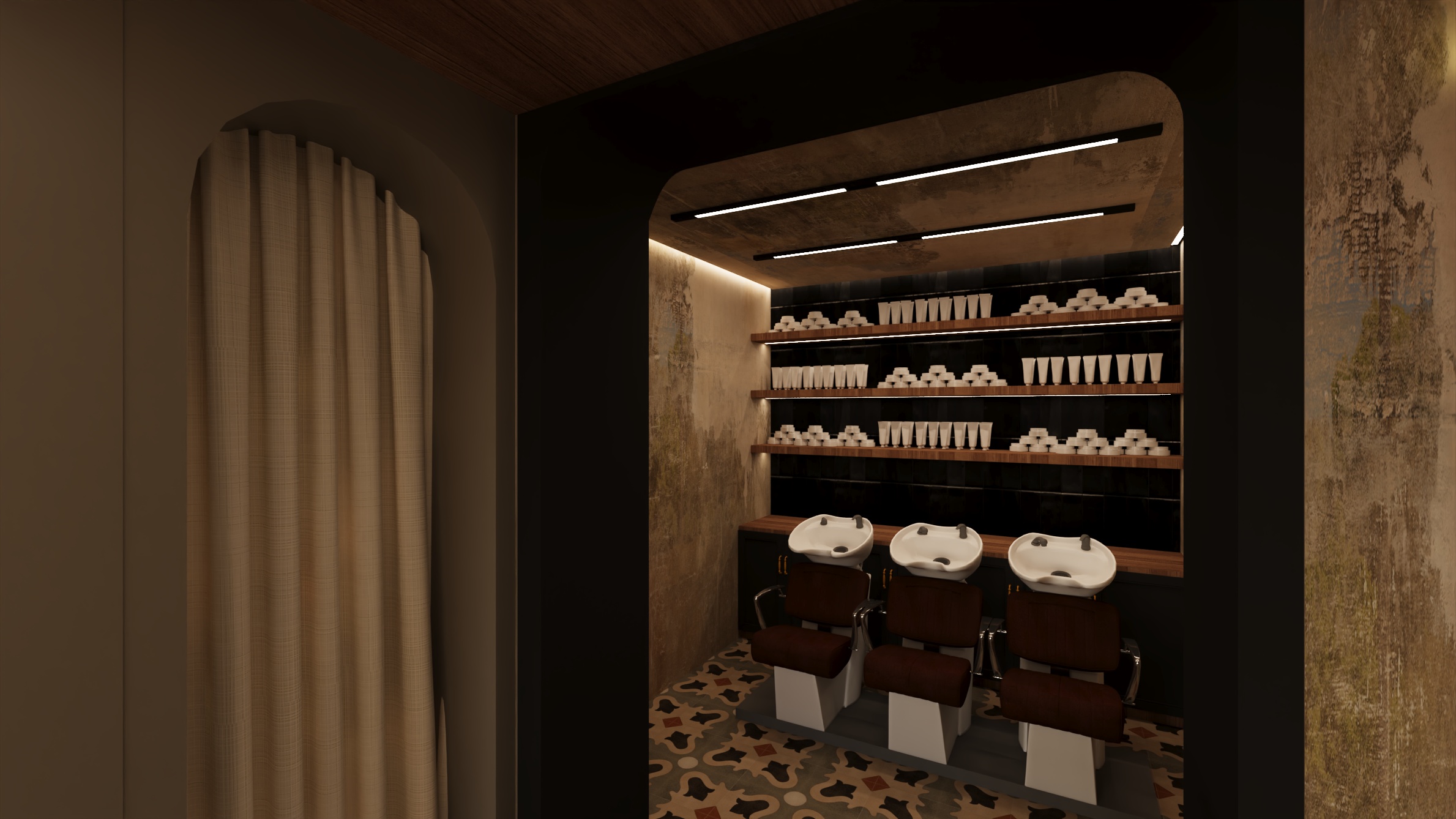 Le poltrone originali sono state rivestite e mantenute, così come le postazioni al lavatesta.