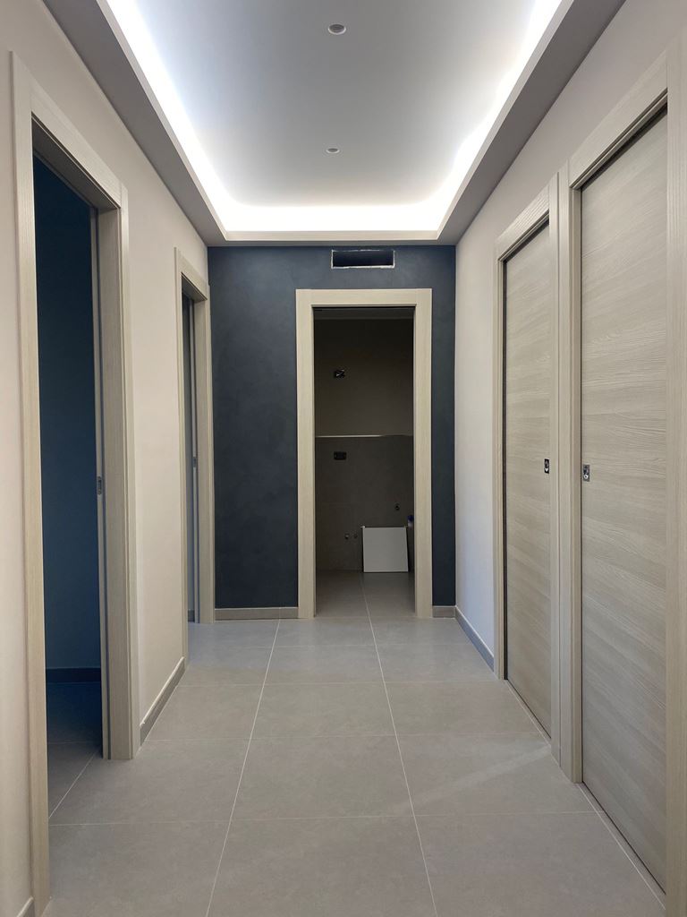 La zona notte è separata da una porta scorrevole, sulla sinistra è stato ricavato un grande ripostiglio a seguire due camere non ancora arredate per le quali abbiamo però predisposto prese in ogni lato. Avendo qualche mq in più ho deciso di ricavare nel fondo del corridoio la lavanderia, un ambiente troppo spesso sottovalutato che se presente consente di mantenere più ordine in casa. La camera padronale ha tutto il necessario compreso il bagno privato. Nella zona notte troviamo anche il bagno per gli ospiti compreso di tutto.