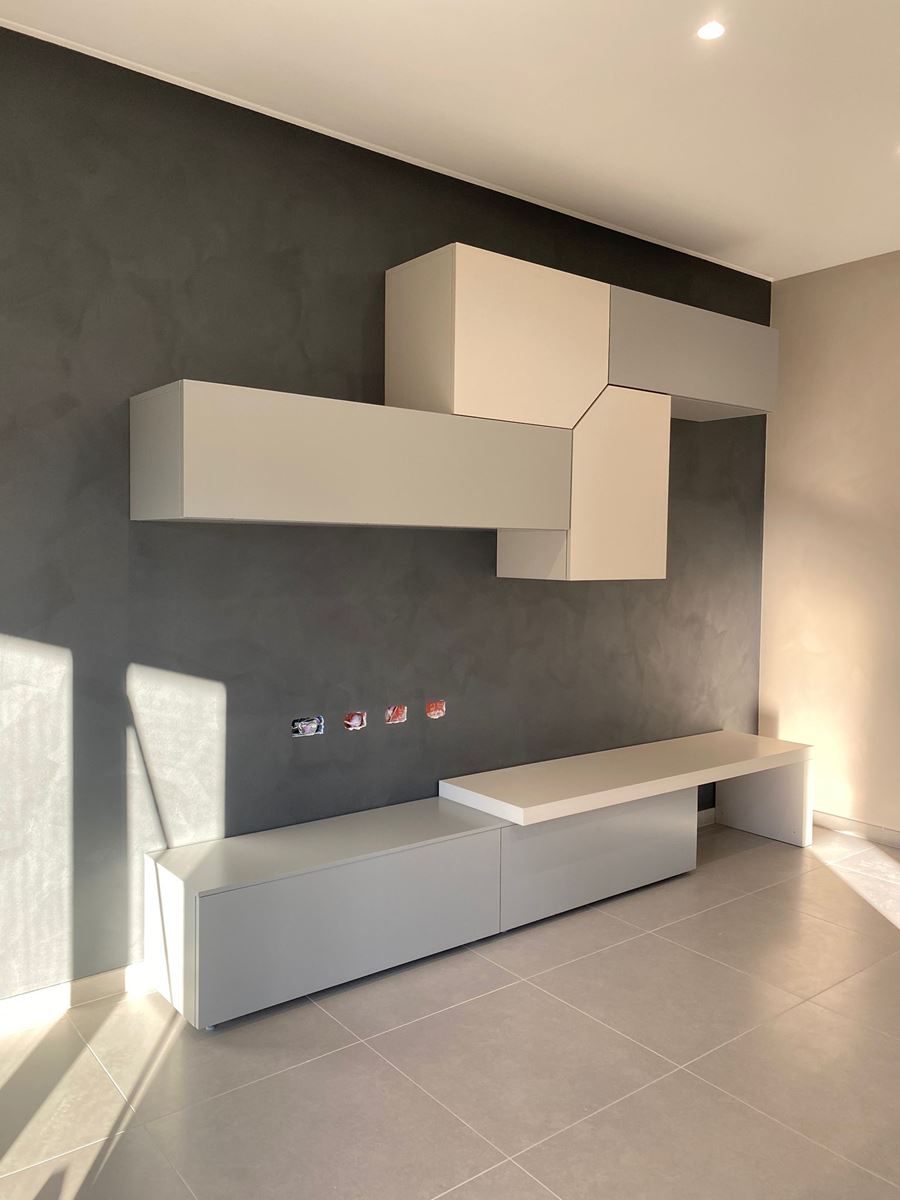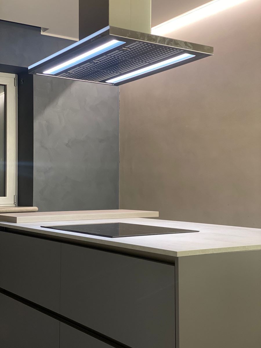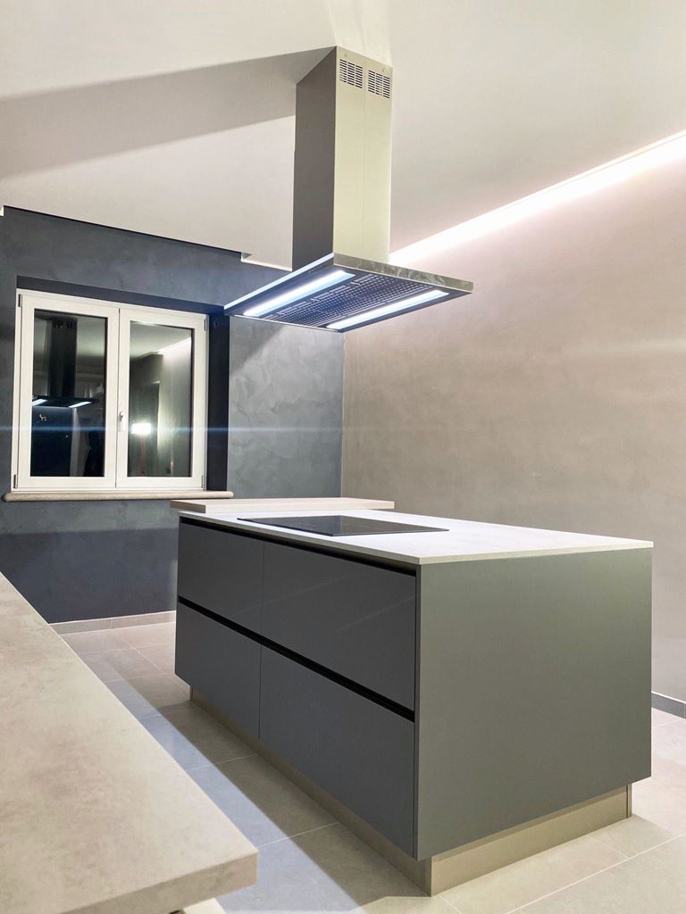 La giovane coppia è solita organizzare cene e pranzi con amici e parenti quindi lo spazio maggiore è stato dedicato alla zona living, questo ambiente di 58 mq ospita una grande cucina con isola dotata di snack per fare colazione, con cappa a libera installazione, dal lato opposto un grande divano ad L rivolto verso la parete attrezzata con tv, il tavolo è stato posizionato tra questi due elementi ma può essere spostato centralmente alla sala e allungarsi per ospitare anche venti persone.