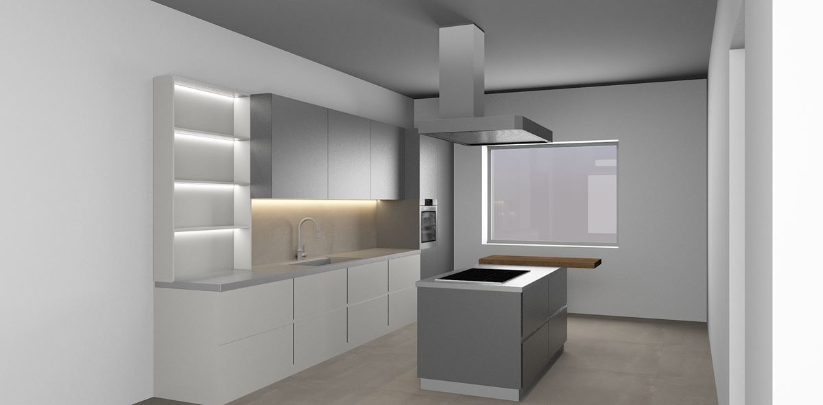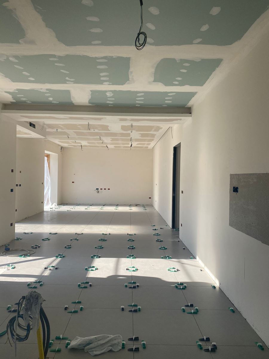 Suddividere l’ambiente al fine di creare una casa con salone con cucina open space, due bagni, camera padronale, due camere e una dispensa.