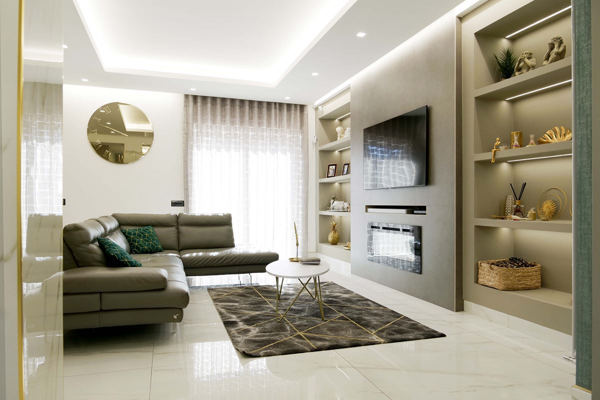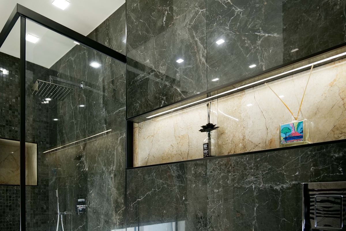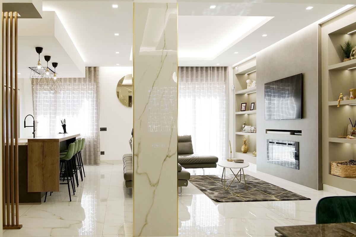 Procedendo troviamo il nucleo di questo appartamento un grande salone open space caratterizzato da un’enorme parete attrezzata che ospita tv, camino elettrico e nicchie laterali illuminate, il divano angolare precede l’enorme isola scura impreziosita da un top in HPL calacatta.