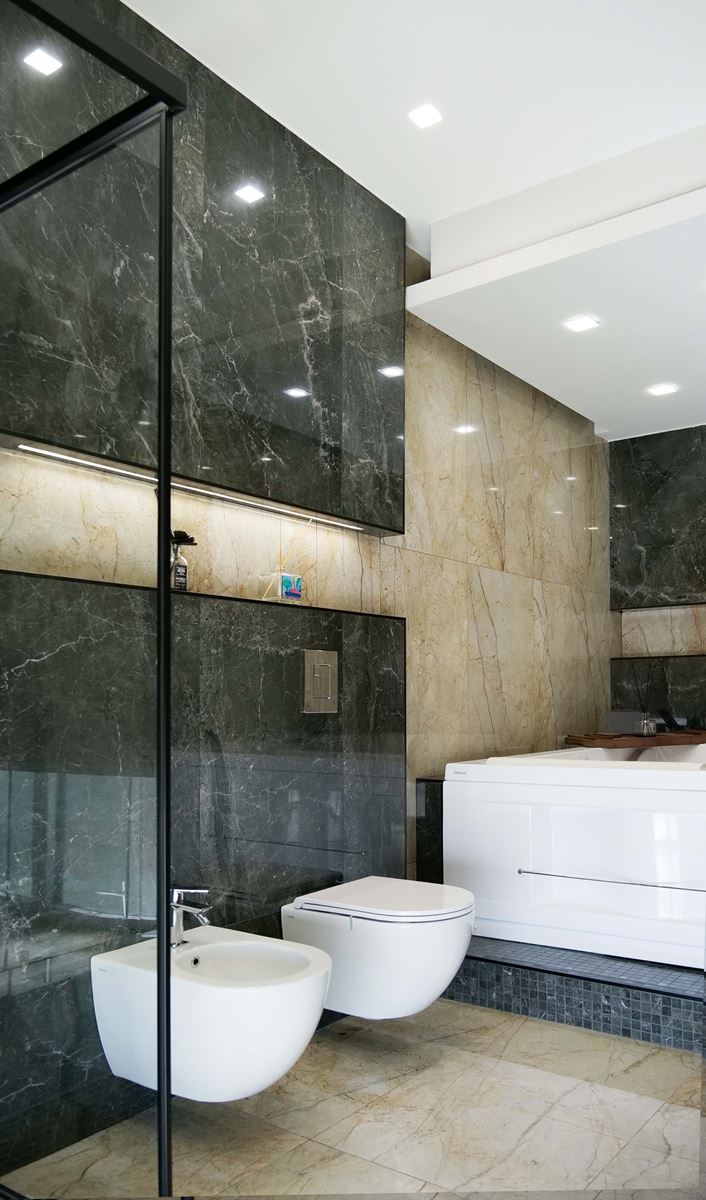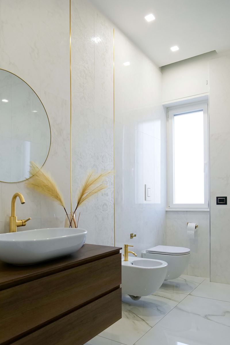 La camera padronale è la stanza più grande dopo il salone, insieme alla cabina armadio e bagno si distribuisce su 50 mq. Una carta da parati dalle sfumature oro e marrone decora l'ambiente, il letto è stato rivestito con un tessuto più adatto alle nuove tonalità, la stanza guardaroba ha la conformazione a C la più richiesta per questo genere di spazio. La forma del bagno ad L è stata studiata per dividerlo in due, prima incontriamo il mobile con doppio lavabo, colonne laterali e rubinetteria a parete e doccia 80x100, girando ci sono i sanitari che rispetto all porta si trovano nascosti e la grande vasca idromassaggio.