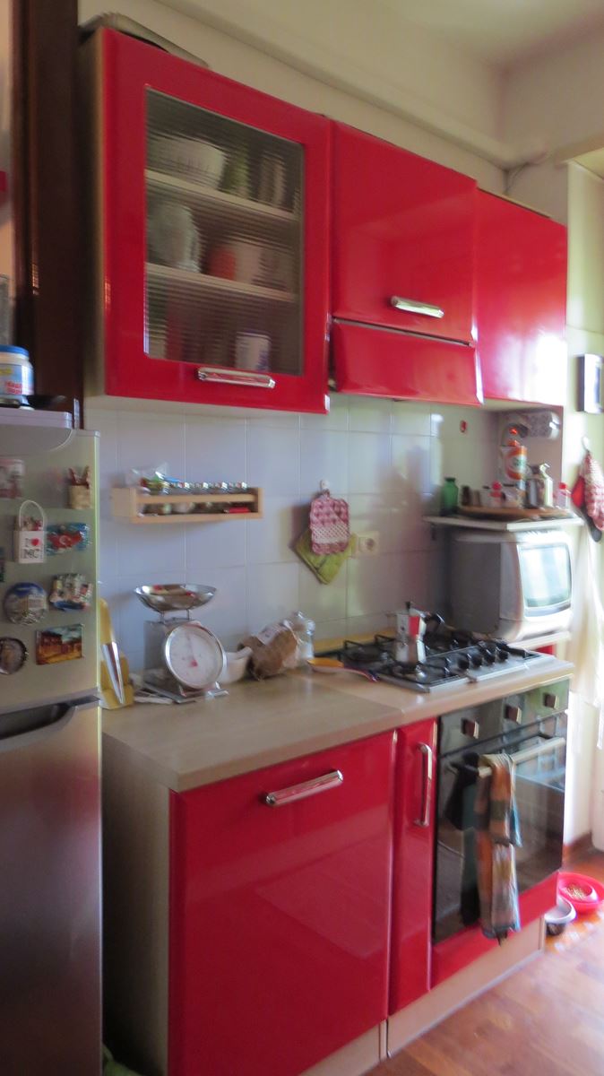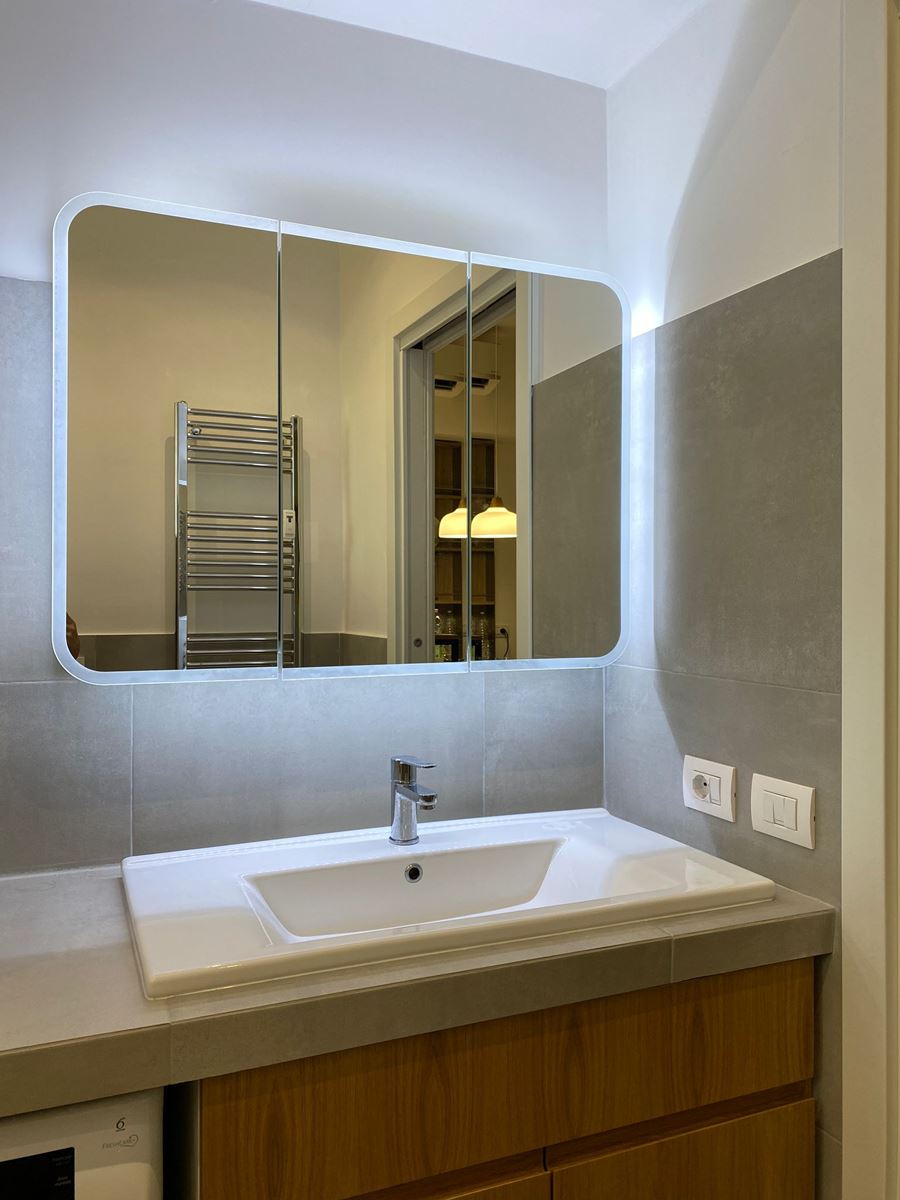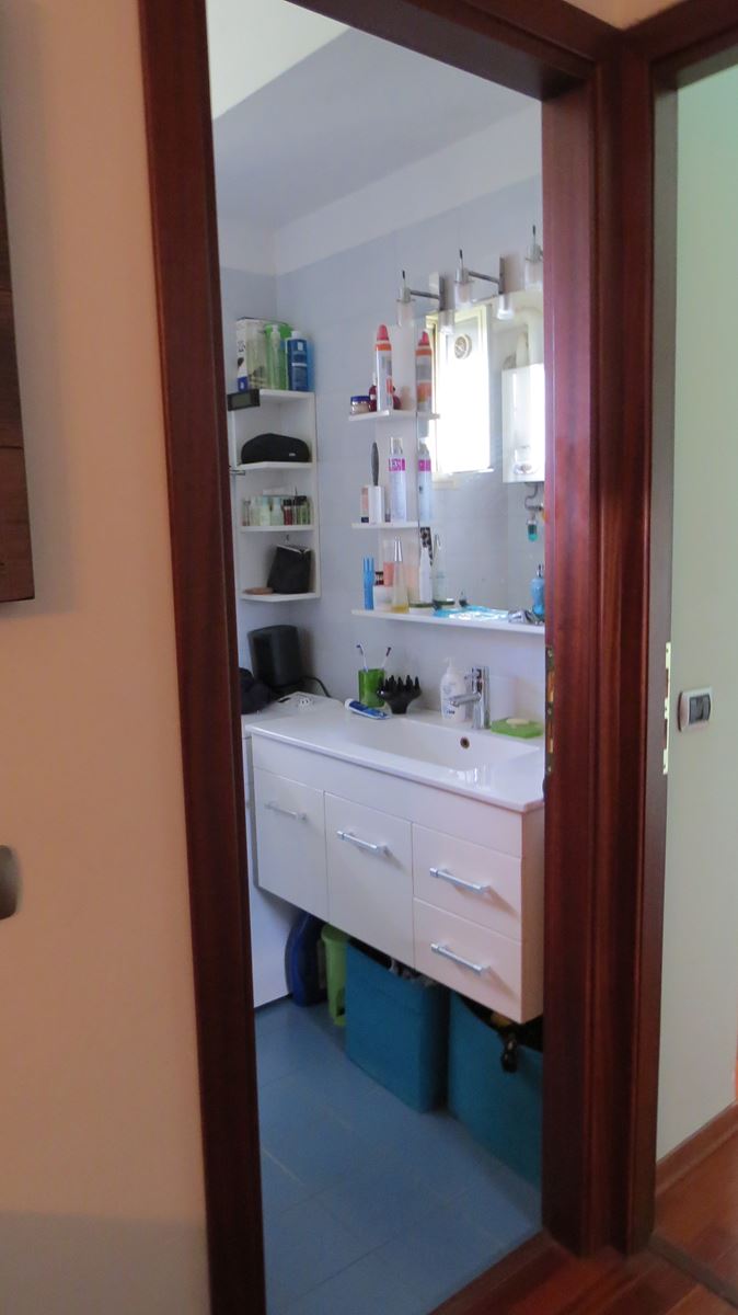 Dovendo rifare tutto il bagno abbiamo deciso di spostare anche se di poco (10 cm) sia il tramezzo che divideva la cucina dal bagno, che quello che divideva il bagno dalla camera da letto, ci ha permesso di incassare le colonne della cucina che prima risultavano invadere l’ambiente lasciando quindi il giusto passaggio e incassare perfettamente il mobile lavabo portandolo anche alla giusta distanza con i sanitari.